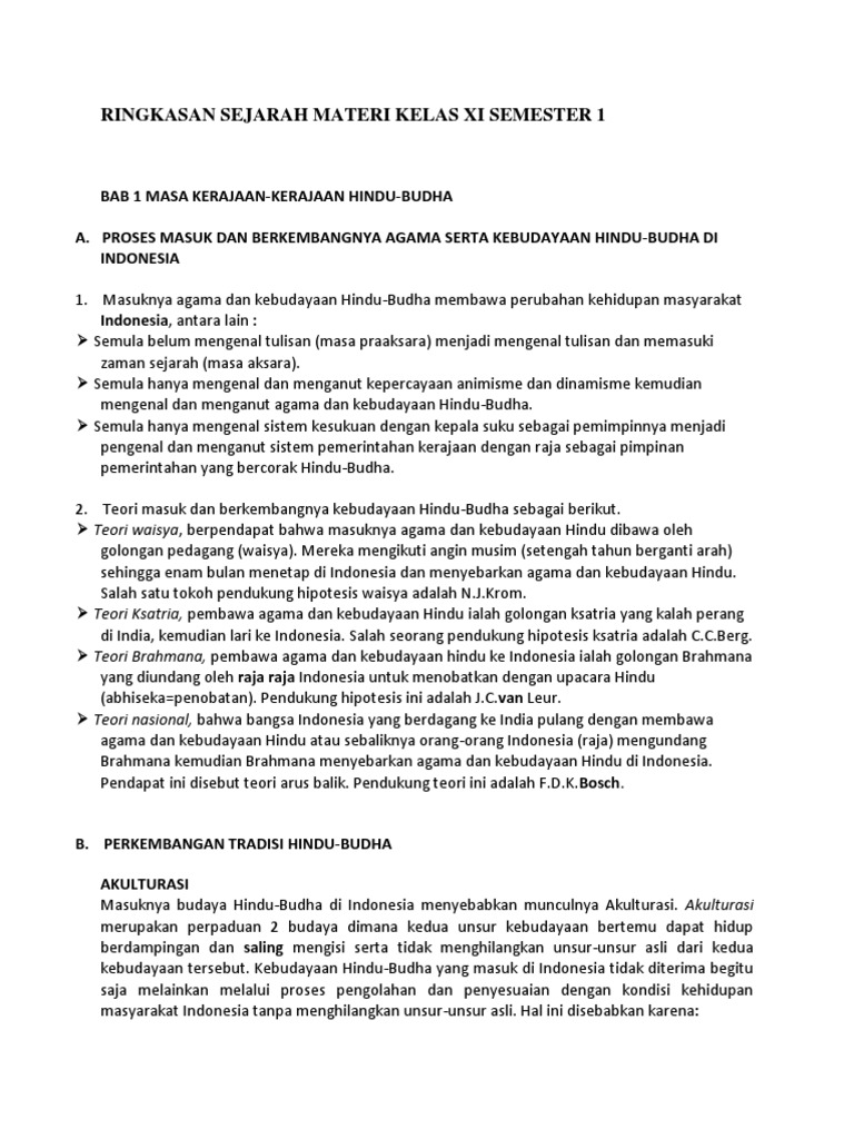 Masuknya agama dan kebudayaan Hindu-Budha membawa perubahan kehidupan masyarakat Indonesia antara lain. KELAS X II MS 3. Rangkuman sejarah indonesia kelas xi semester 1 bab 1.